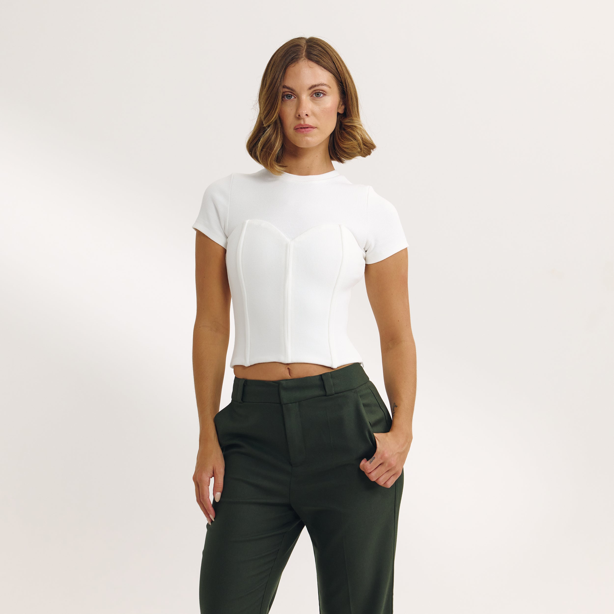 Korsett-T-shirten är en avslappnad tolkning av vår lyxiga underklädesteknik. Det mjuka ribbstickade jerseymaterialet kontrasterar vackert mot de strukturerade kanalerna med benstöd, och skapar ett plagg som formar sig efter kroppen utan att kompromissa med komforten.