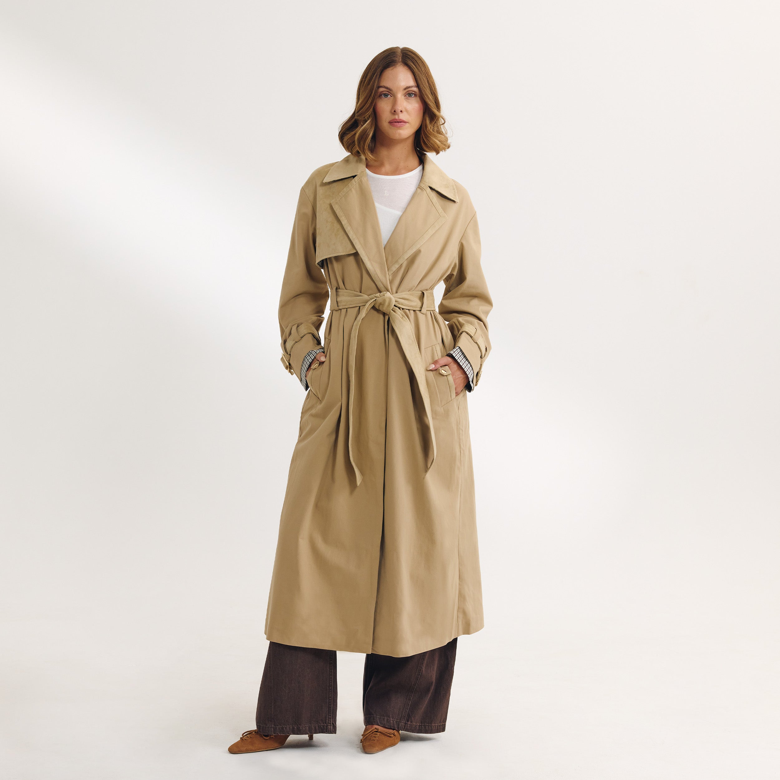 Suedette Trim Trenchcoat - Sandfärgad